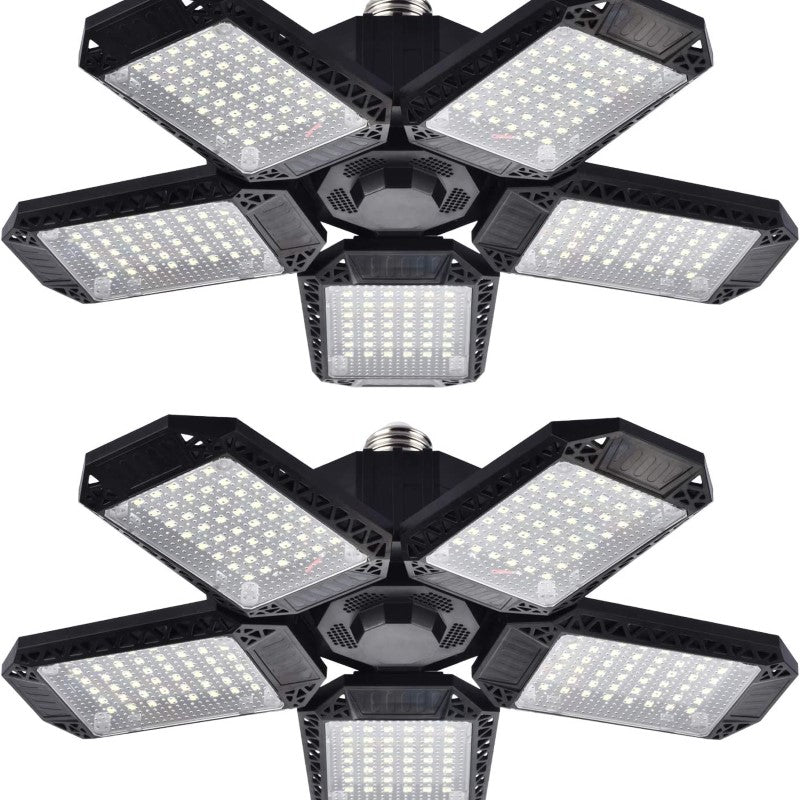 2 Pack LED Garage Lights, 120W Deformable LED Garage Ceiling Lights with 5 Adjustable Panels, 12000LM E26 LED Shop Lights for Garage, Basement, Barn, High Bay Light (2 Pack)