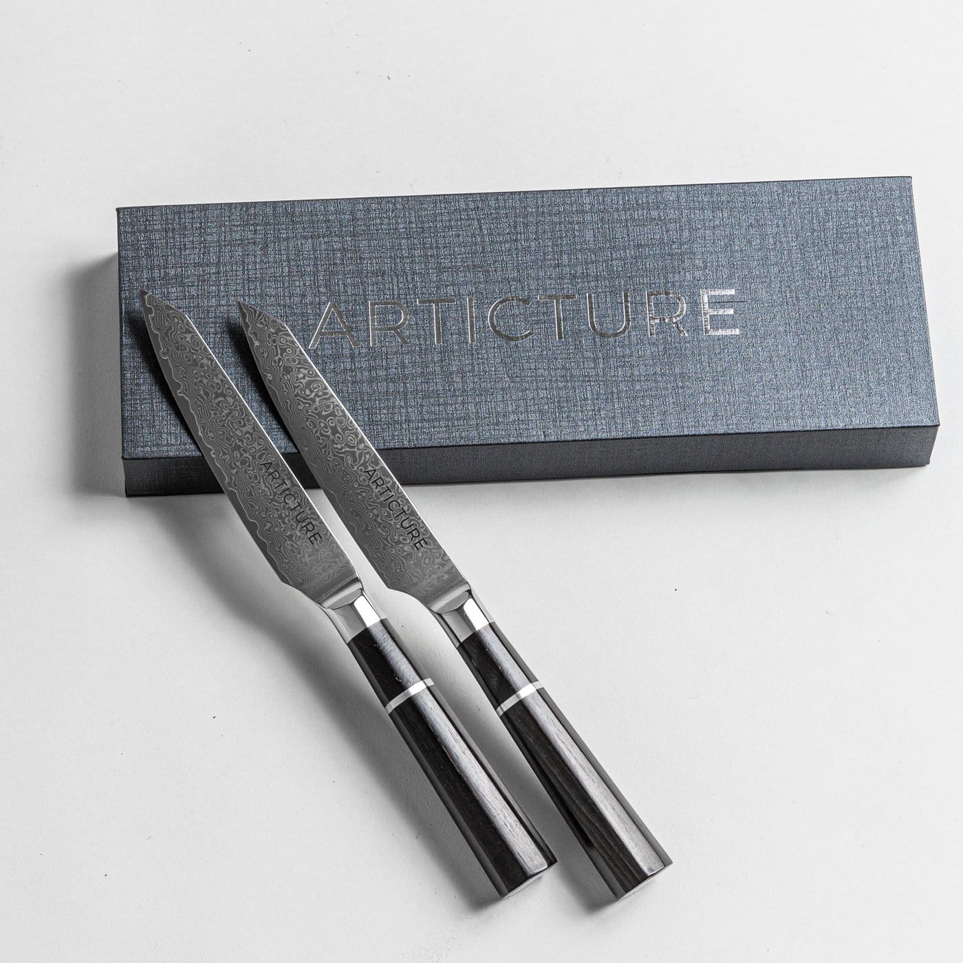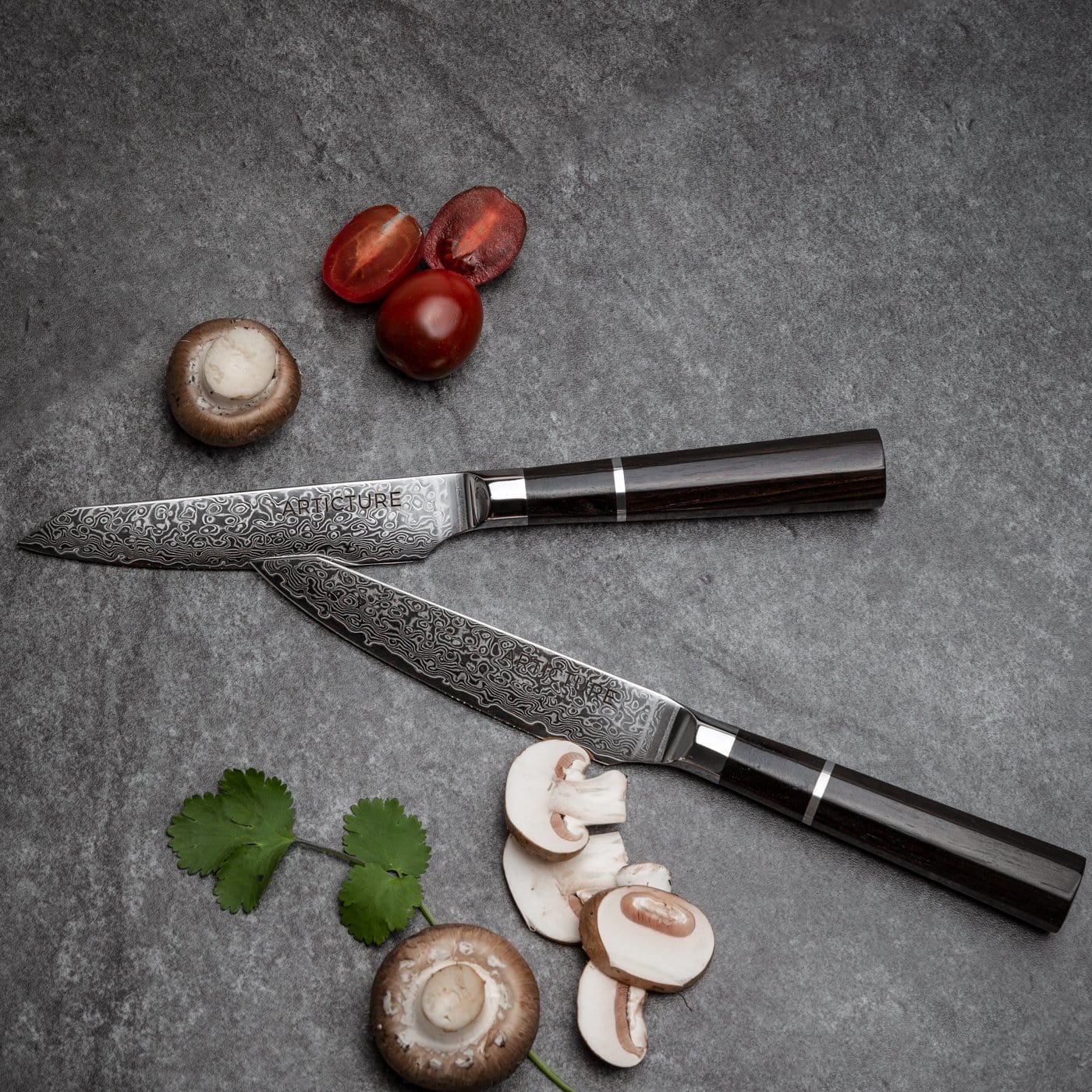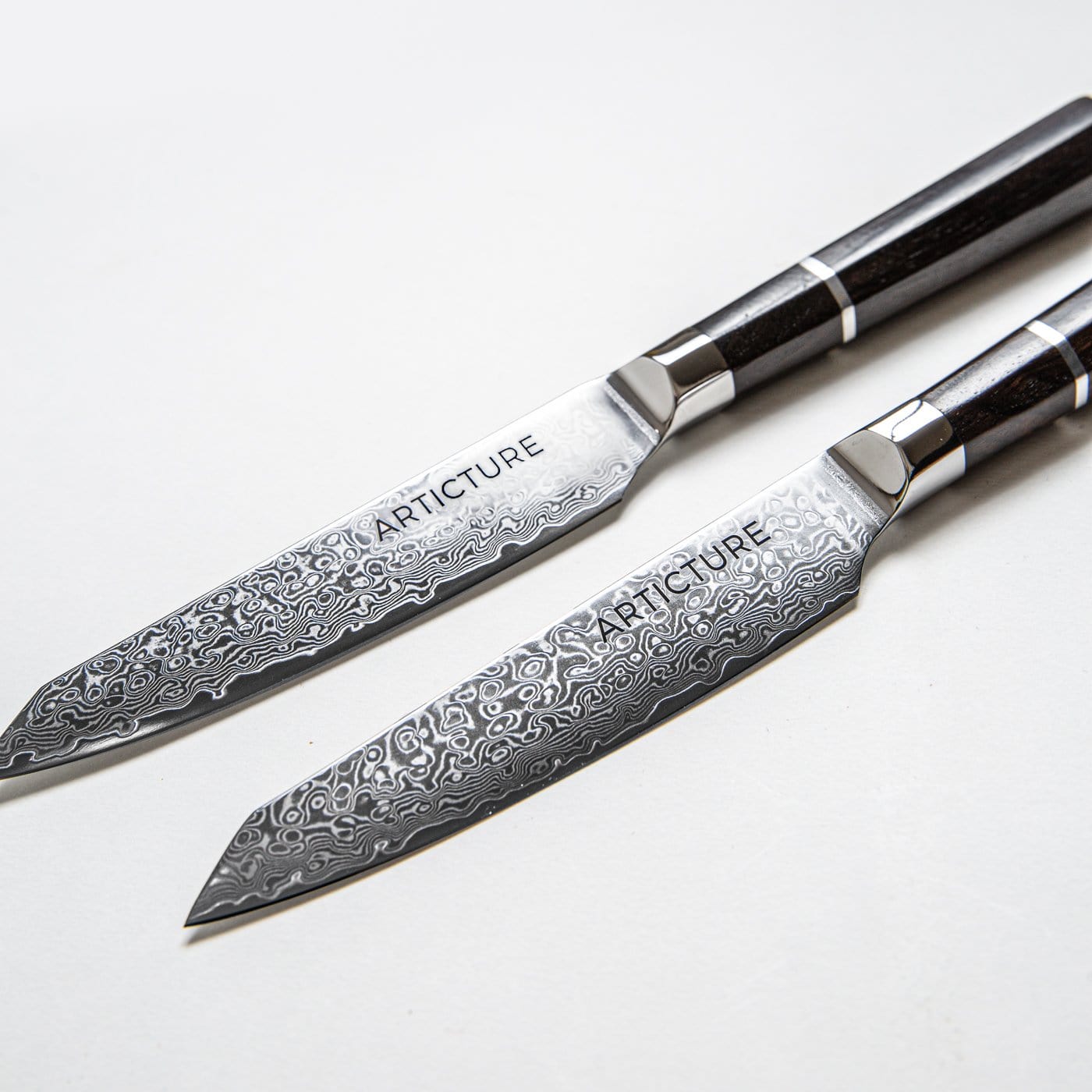 The Afilado Damascus Steel Knife Set gives off a certain allure from its exquisite pattern, toughness and durability. Handcrafted out of 67 Layers of VG-10 Japanese Damascus Steel, its beautiful design impresses with the details of its well-calculated, meticulous style. Visualize your kitchen knives having more aesthetic appeal with their beautiful figure, seriously sharp edge and excellent edge retention. The ebony-wood handle has an ideal size and a very angular profile for superior comfort and control. Kitchen knives with attractive Damascus patterns are at the forefront of the world.
