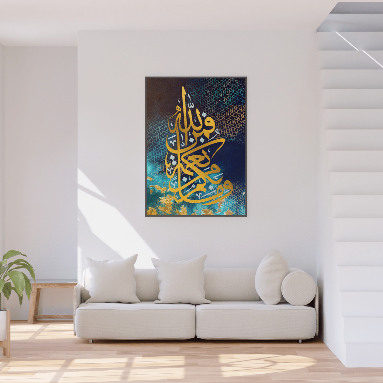 Use that empty wall space to add some Islamically inspired canvas art! This minimalist image depicts beautiful Arabic calligraphy on a bold and mysterious background. The muslim canvas image has been designed to uplift the walls of any home. Each product is printed and stretched with extreme care and detail to carefully fit within its frame.