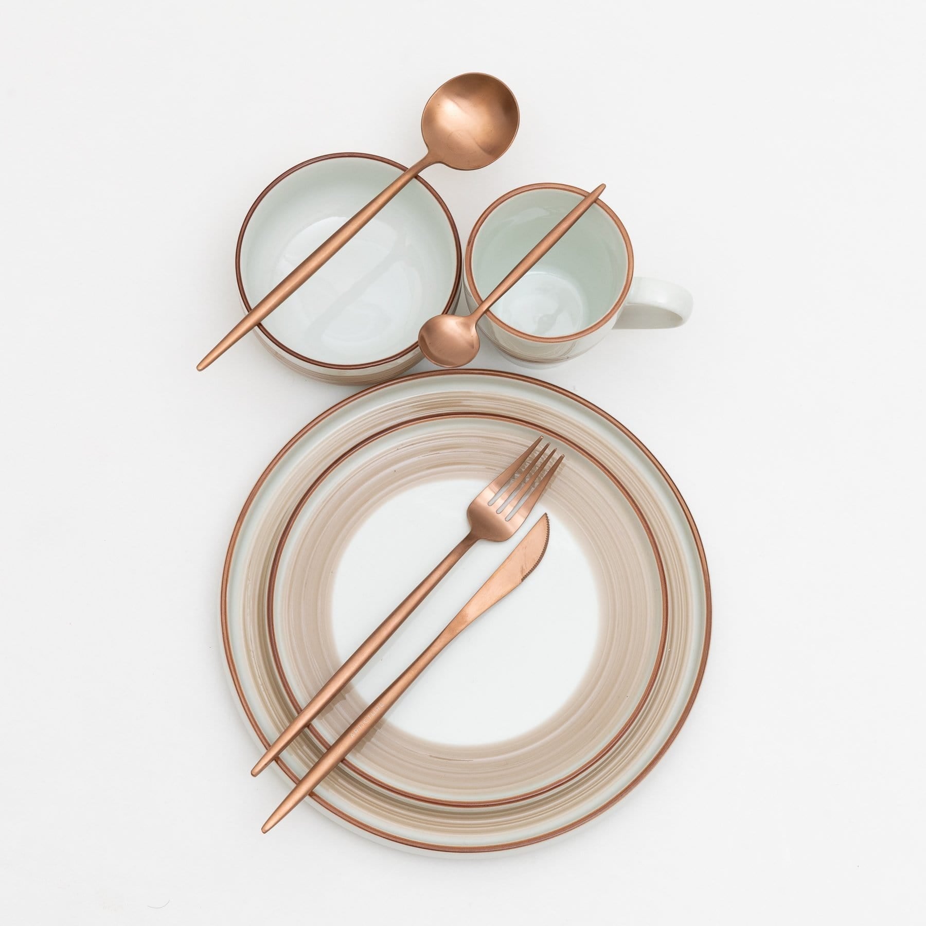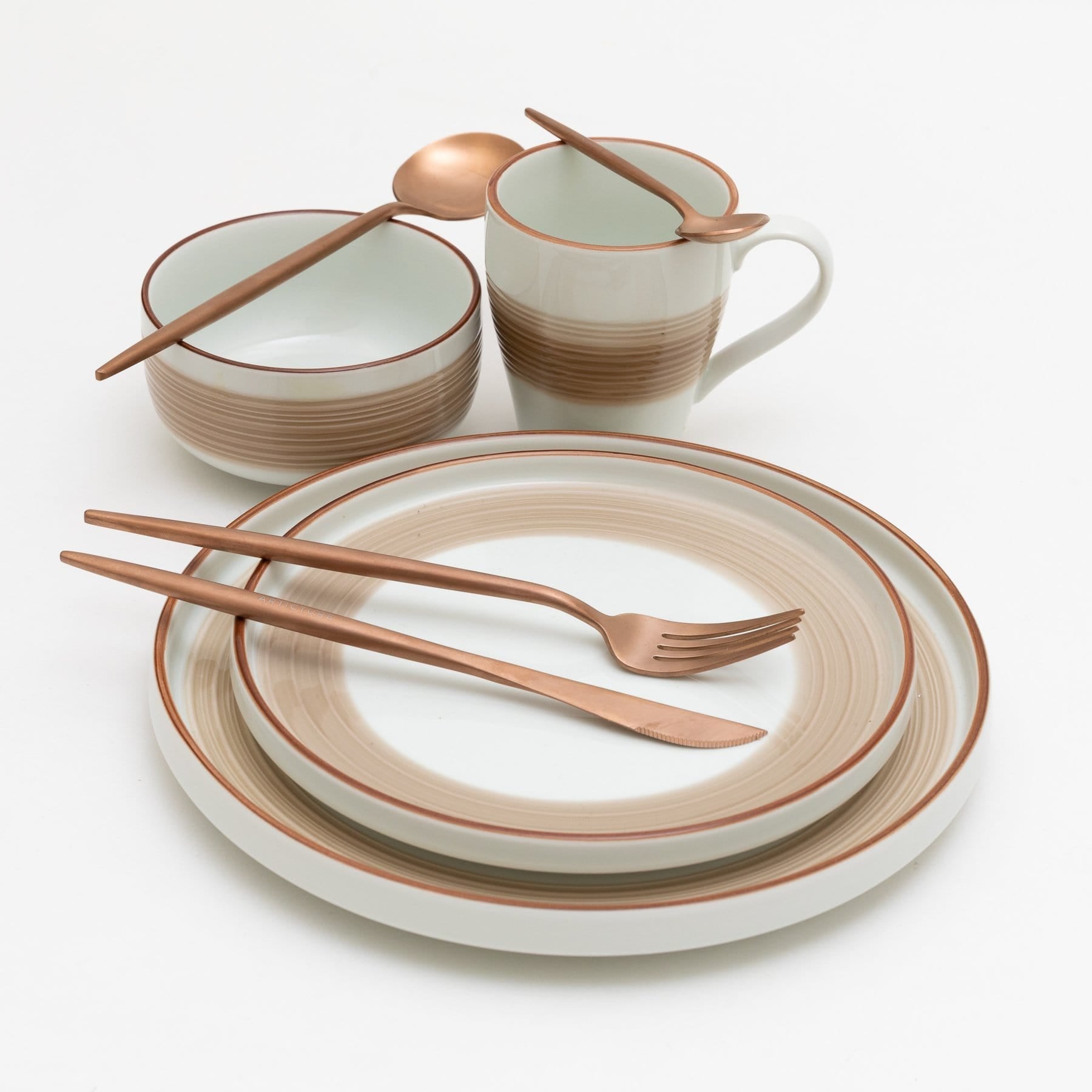 Rose Gold — Looking to charge up your dinnerware set? Swap out tired plates with the Caco Dinnerware Set. Dress up your table with exciting rose gold colour strokes and a copper-coloured rimmed dinnerware set that shows off your artistic side and adds a majestic feel to everyday dining. The mix of modern and classic elements allows these pieces to pair well with any décor and look great in your cupboard, open shelves, or on your dining room table.
