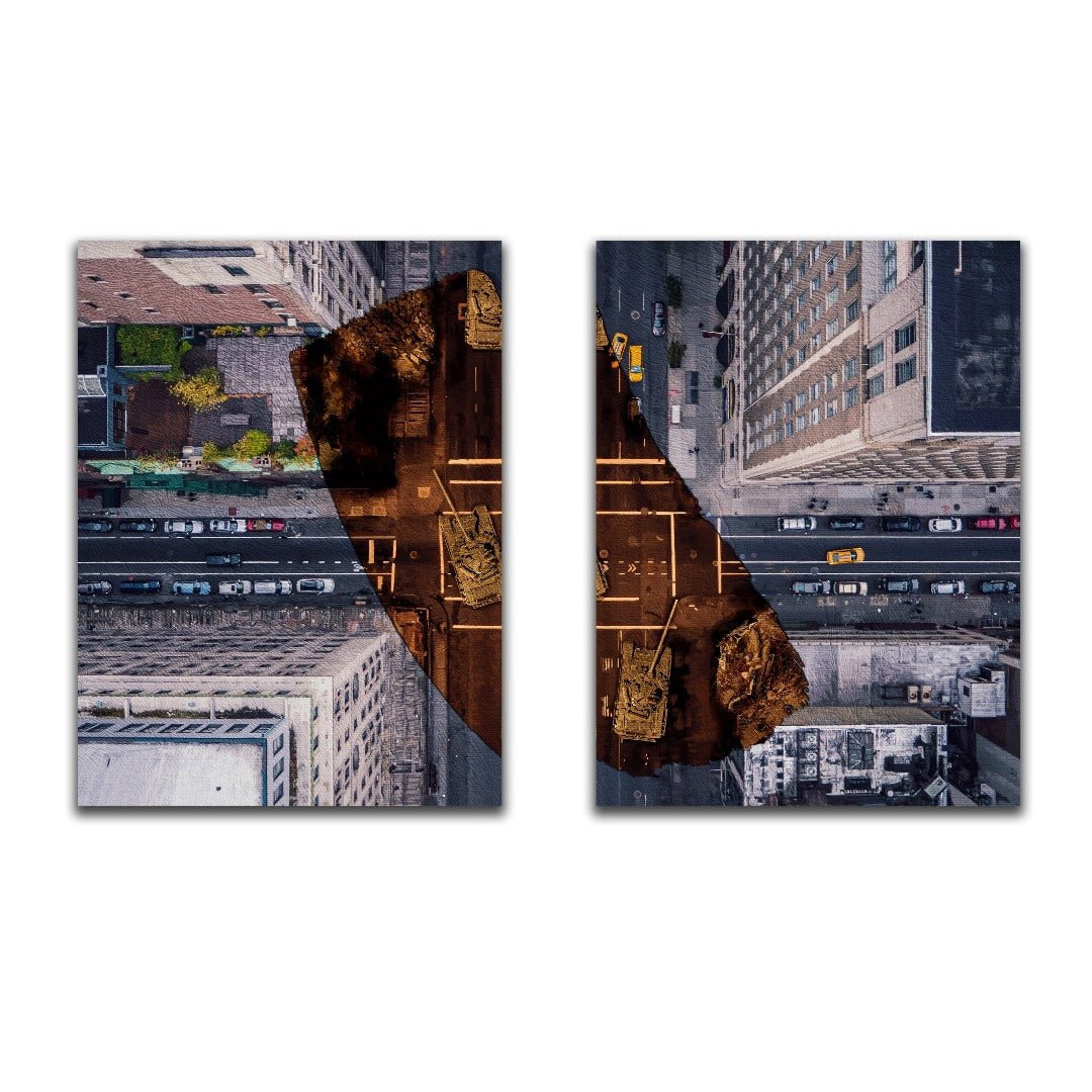 This piece explores the dangerous impact of conflict. Each product is printed and stretched with extreme care and detail to carefully fit within its frame.
