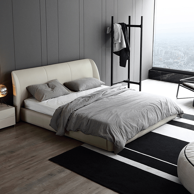 A beautiful Cream leather upholstered bed, made from a solid wood frame. The bed is cushioned with premium foam.