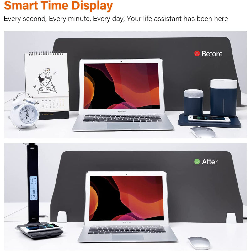 - LCD FUNCTION: You can press the "On/Off button" for 3 seconds to turn on/off the LCD screen light. Includes a digital clock for time, date, and temperature display. Set an alarm or time for your desk light. Remove clutter from your office desk!
