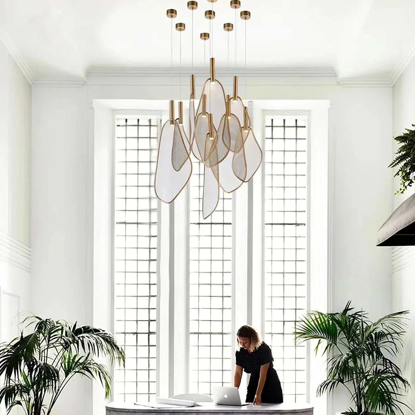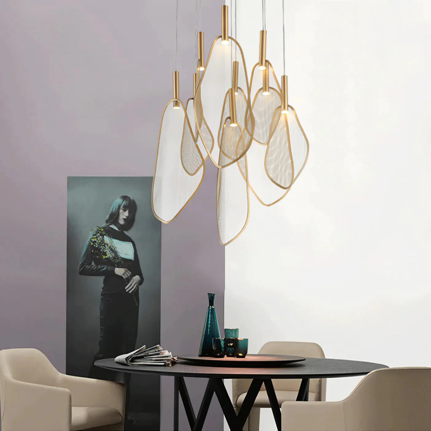 Introducing the Fanna Sue Pendant Light - a stunning lighting fixture that effortlessly combines functionality with an eye-catching design. This pendant light features a unique design of a fan, rendered in a beautiful gold color that will add a touch of elegance and sophistication to any space.