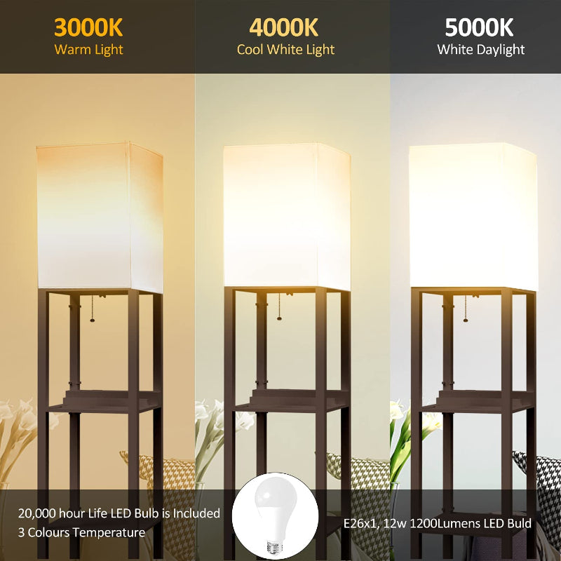 - 3 Color Temperature LED Bulb Included; Our shelf floor lamp includes a 9-watt, 1000-lumen power-saving LED bulb. The LED lamp bulb is 3 color temperature 3000 Kelvin, 4000 Kelvin, and 5000 Kelvin. Our floor lamps with shelves are perfect for bedrooms, living rooms, reading rooms,s and offices.