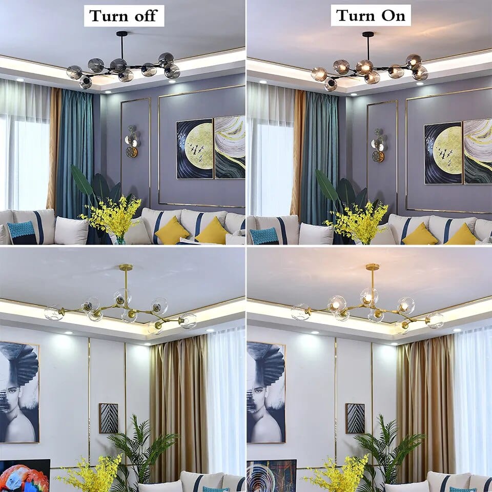 Create a striking, contemporary feel in any living room when you hang the Gaffer Chandelier. Its circular lights seem to float effortlessly in air, providing a vintage Mod feel that will update your home and impress your guests.