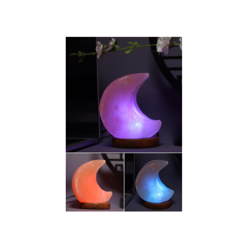 Himalayan Salt Lamp With Wooden Base-Moon light is a perfect bedroom light. It is a warm light that has a moon shape and emits a beautiful glow of purple color.