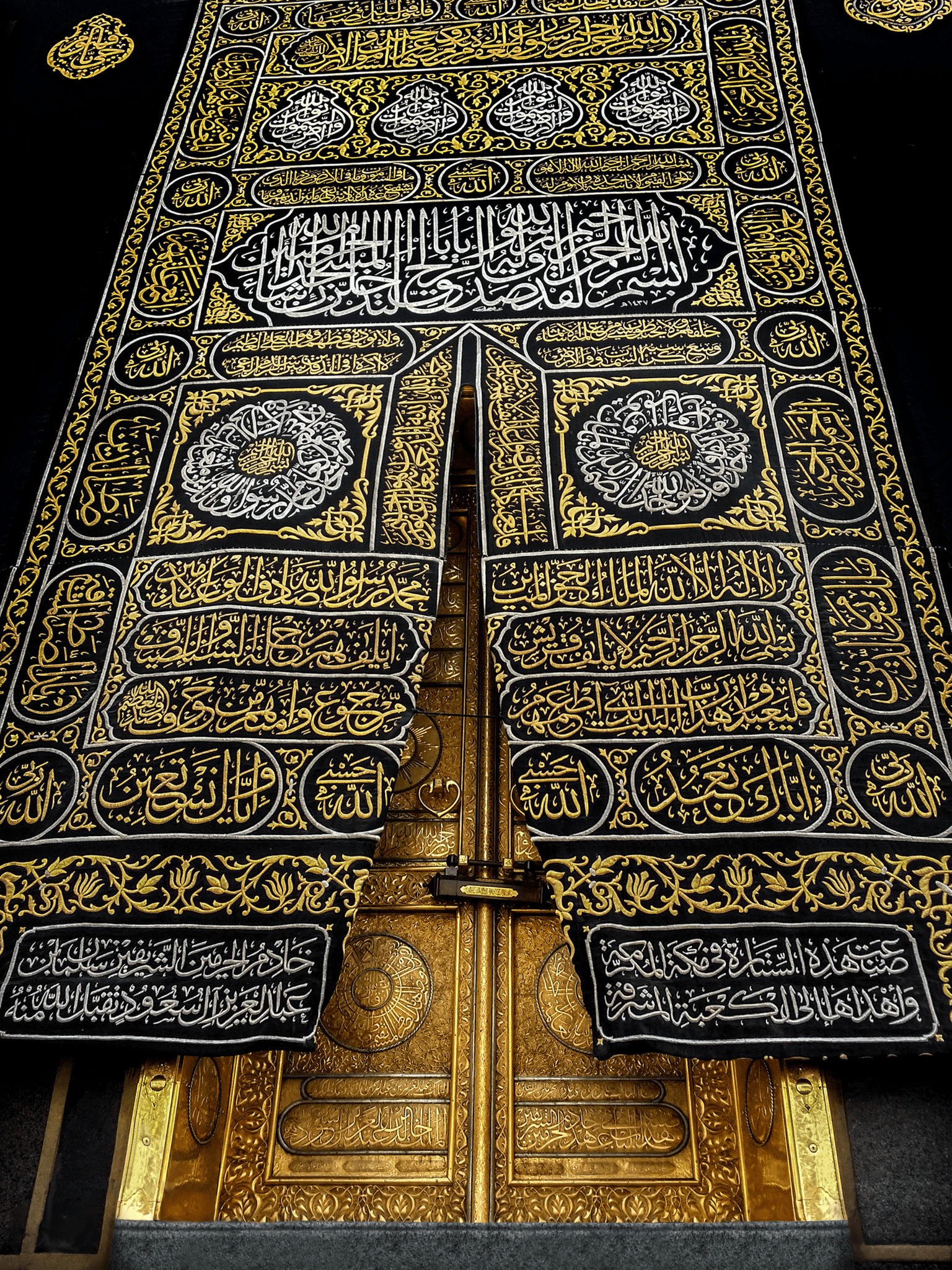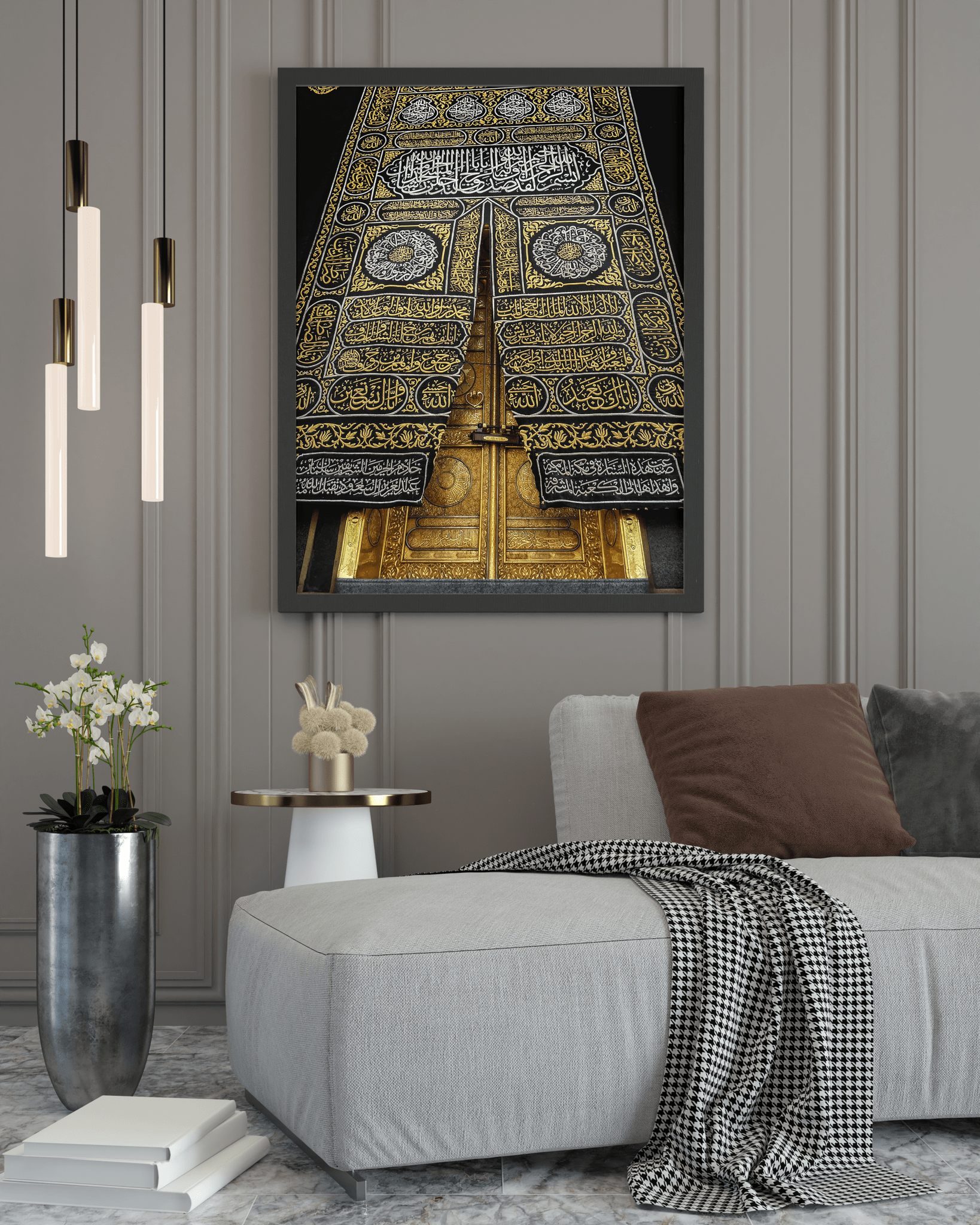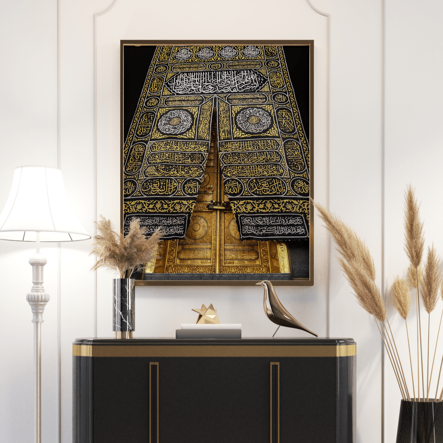 Use that empty wall space to add some Islamically inspired canvas art! This image depicts the Kaaba doors as well as the beautifully adorned kiswah. The muslim canvas image showcases the sacred mosque's doors and the glorious calligraphy that is hand stitched on the outer cloth. Each product is printed and stretched with extreme care and detail to carefully fit within its frame.