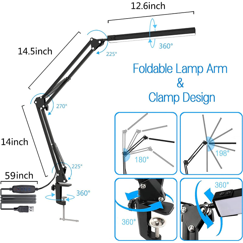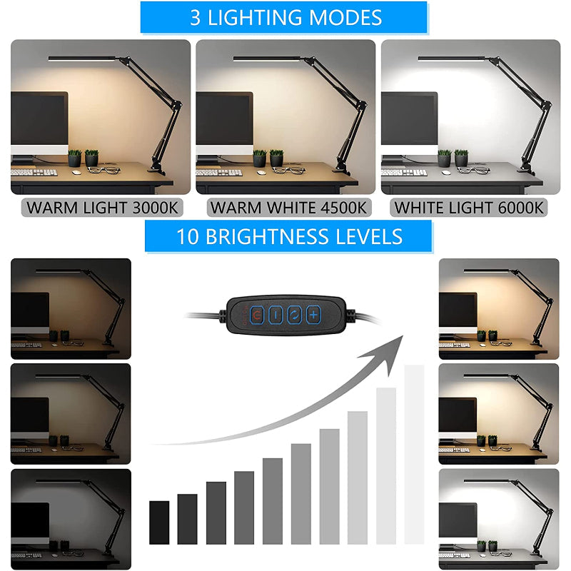 - 10 Brightness Eye-Caring & 3 Color Temperature: Long arm lamp provides Dimming Design (from 3200K to 6500K). Its light is very uniform and can prevent blue light damage to the eyes. This lamp is suitable for all ages, no matter children or grandparents, and easily protect your family's eyes.