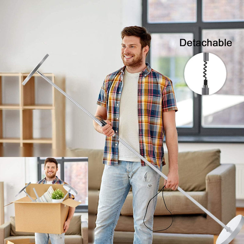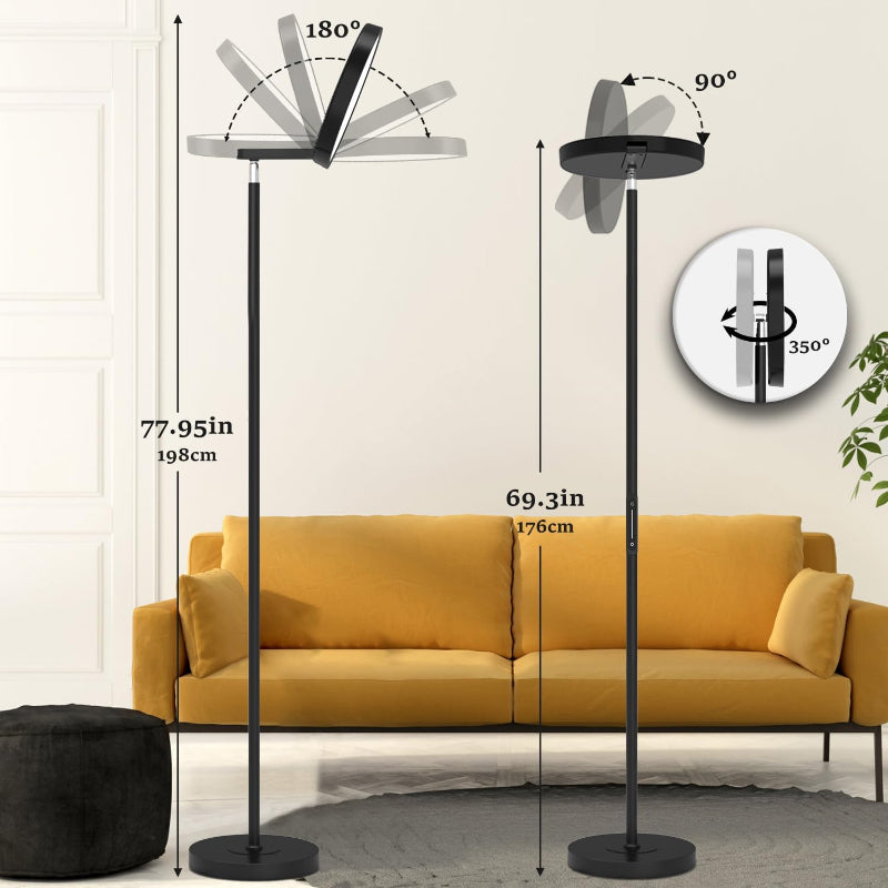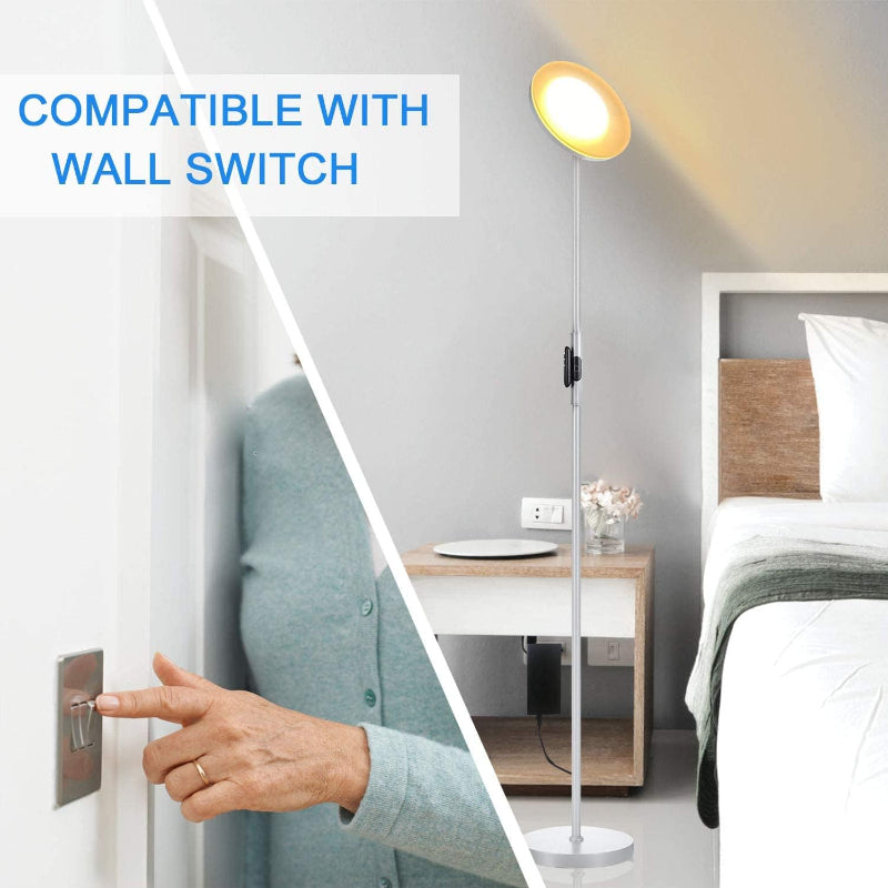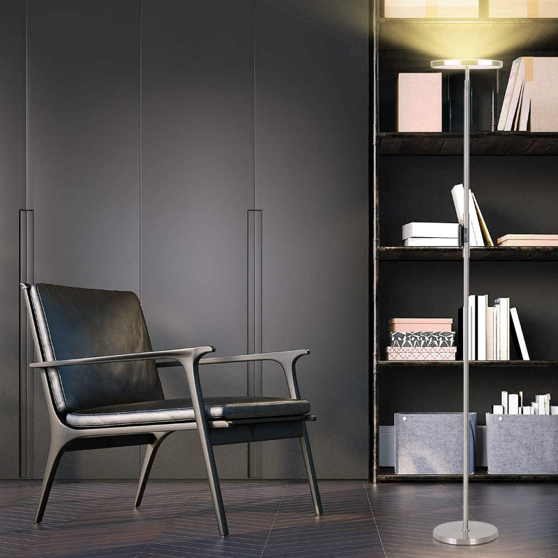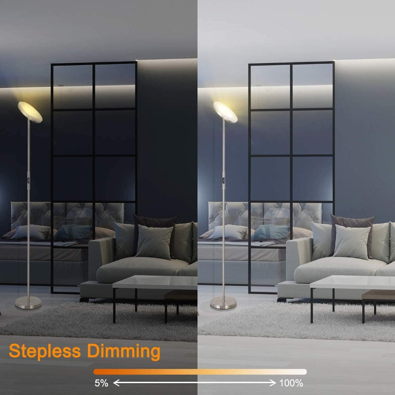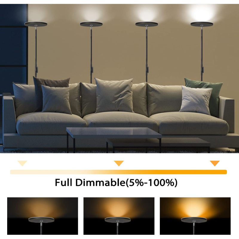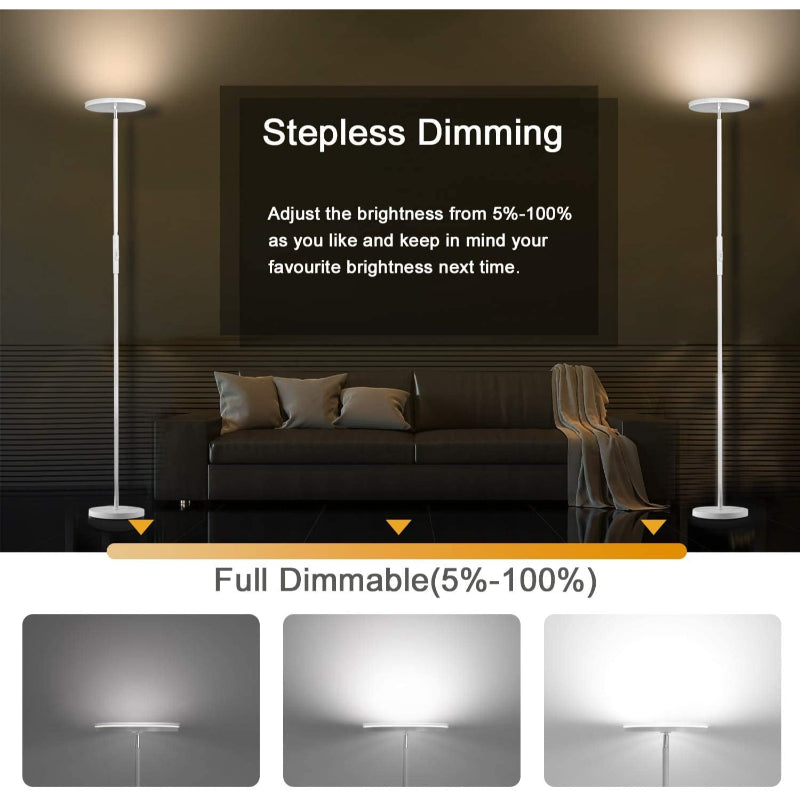 Elevate your home lighting with this sleek and modern LED Modern Torchiere Floor Lamp With Remote And Touch Control, designed to provide powerful, customizable lighting to any room. With a 30W LED that matches the brightness of a 200W incandescent bulb, this lamp is both energy-efficient and durable, boasting up to 100,000 hours of light. It features three color temperature settings (3000K to 5000K) and stepless dimming from 5% to 100%, allowing you to adjust the light to suit your mood or needs. The heavy, stable base makes it safe around children and pets, and its compact design fits easily under sofas or in narrow corners. Equipped with both remote and touch control, this floor lamp combines convenience with advanced technology to enhance your living space.