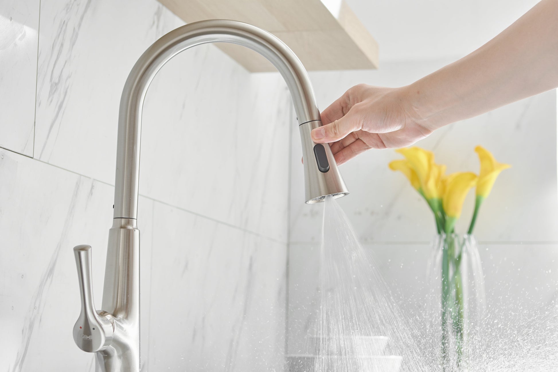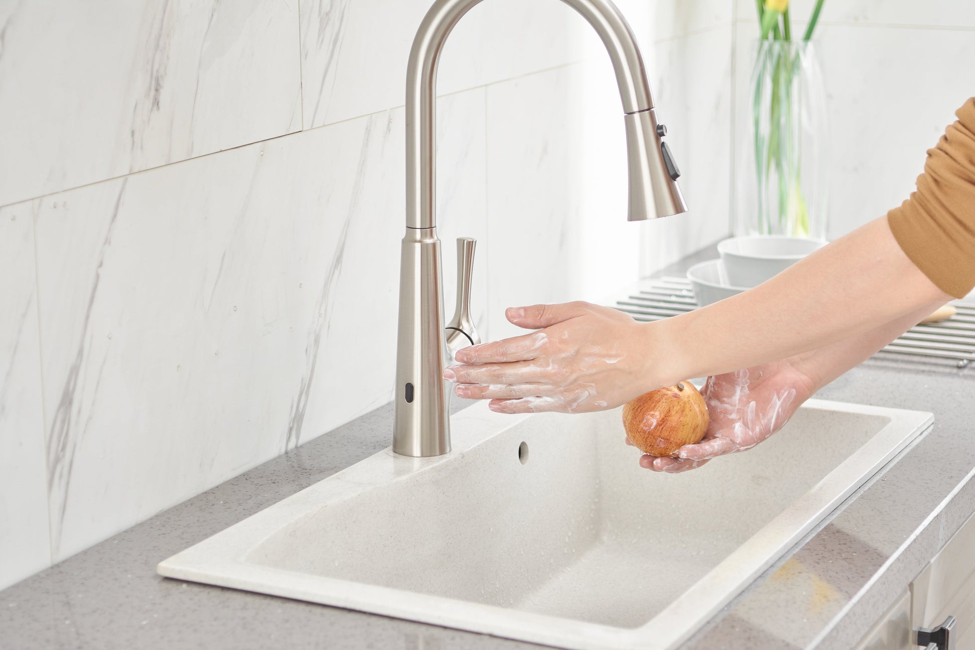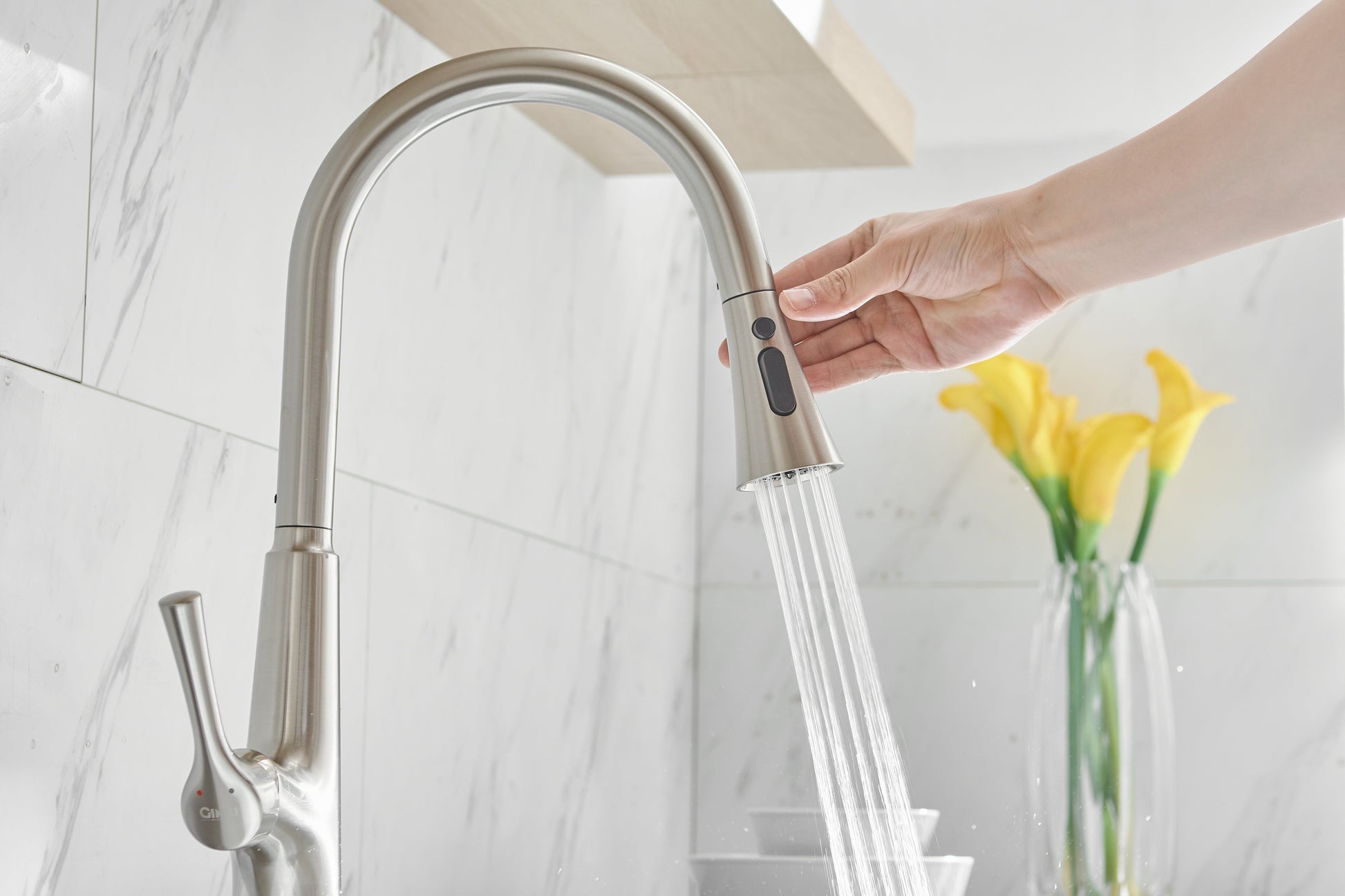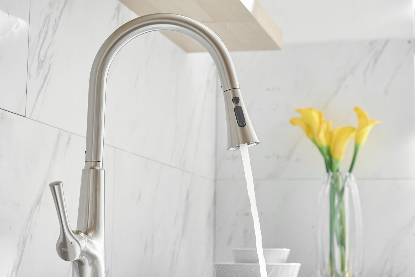 Perfect for busy kitchens, this faucet cuts down on germ transfer so that you no longer have to touch the faucet spout or handle when cleaning up after messy tasks like preparing raw foods. The conveniently located sensor sits on the side of the faucet to avoid interference with dishwashing and other kitchen tasks. The design features a pull-down spray head for superior maneuverability and an extended range of motion, allowing you to bend, flex, pivot, and reach all around the kitchen sink. The dual-function sprayer switches from aerated stream to powerful spray to rinse dishes and wash away stubborn residue. Heavy-duty construction and premium components ensure long-lasting use.