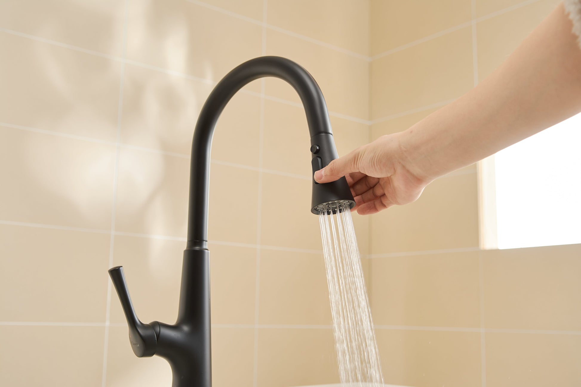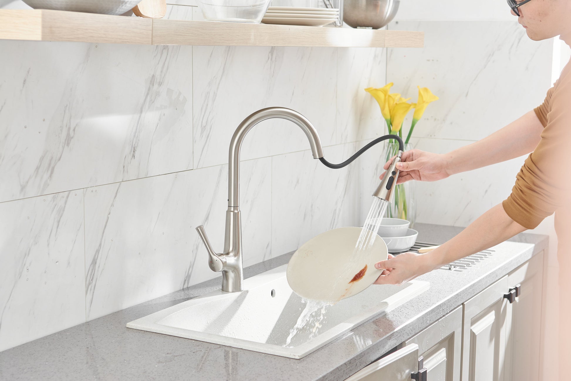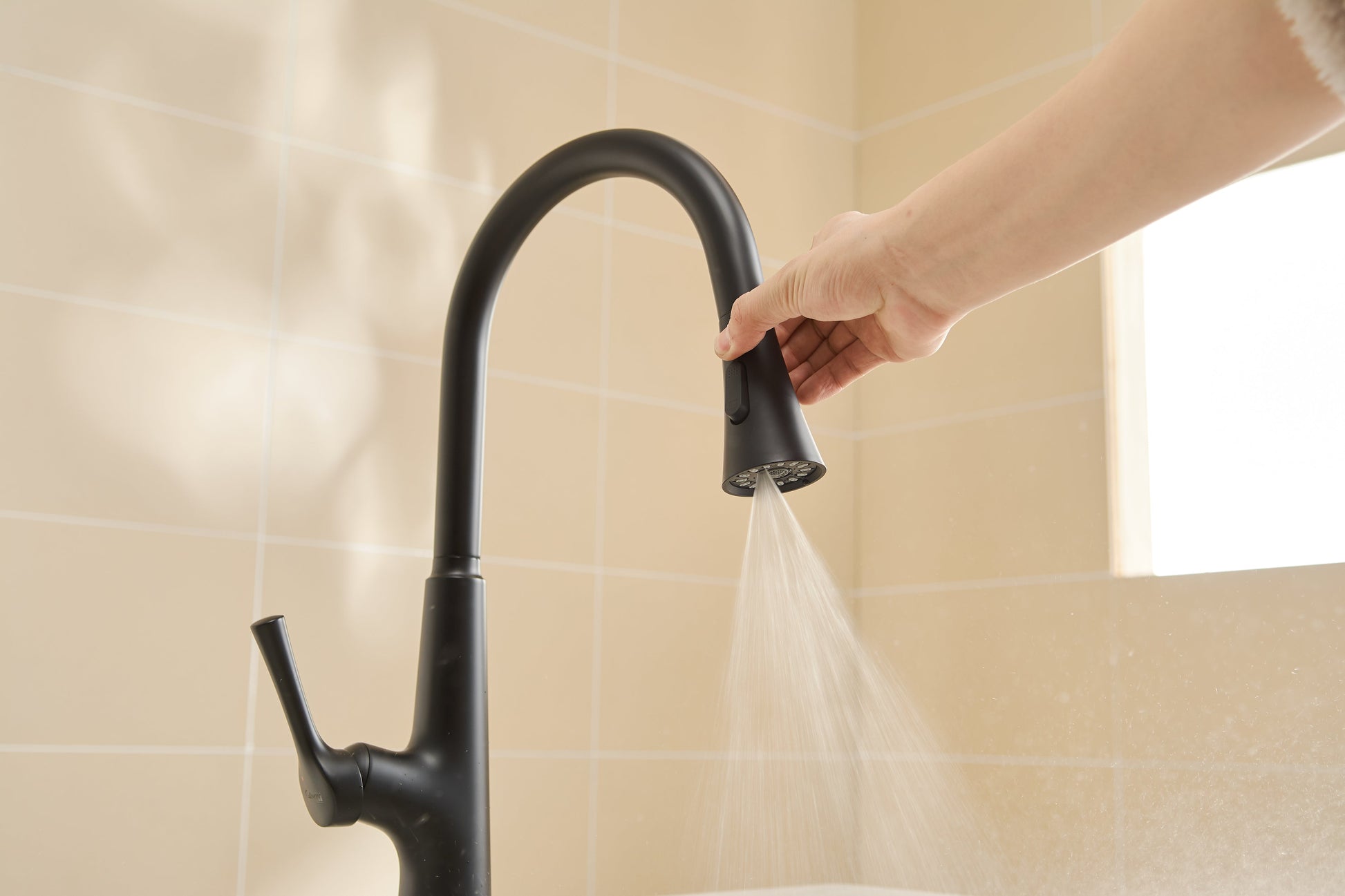 Perfect for busy kitchens, this faucet cuts down on germ transfer so that you no longer have to touch the faucet spout or handle when cleaning up after messy tasks like preparing raw foods. The conveniently located sensor sits on the side of the faucet to avoid interference with dishwashing and other kitchen tasks. The design features a pull-down spray head for superior maneuverability and an extended range of motion, allowing you to bend, flex, pivot, and reach all around the kitchen sink. The dual-function sprayer switches from aerated stream to powerful spray to rinse dishes and wash away stubborn residue. Heavy-duty construction and premium components ensure long-lasting use.