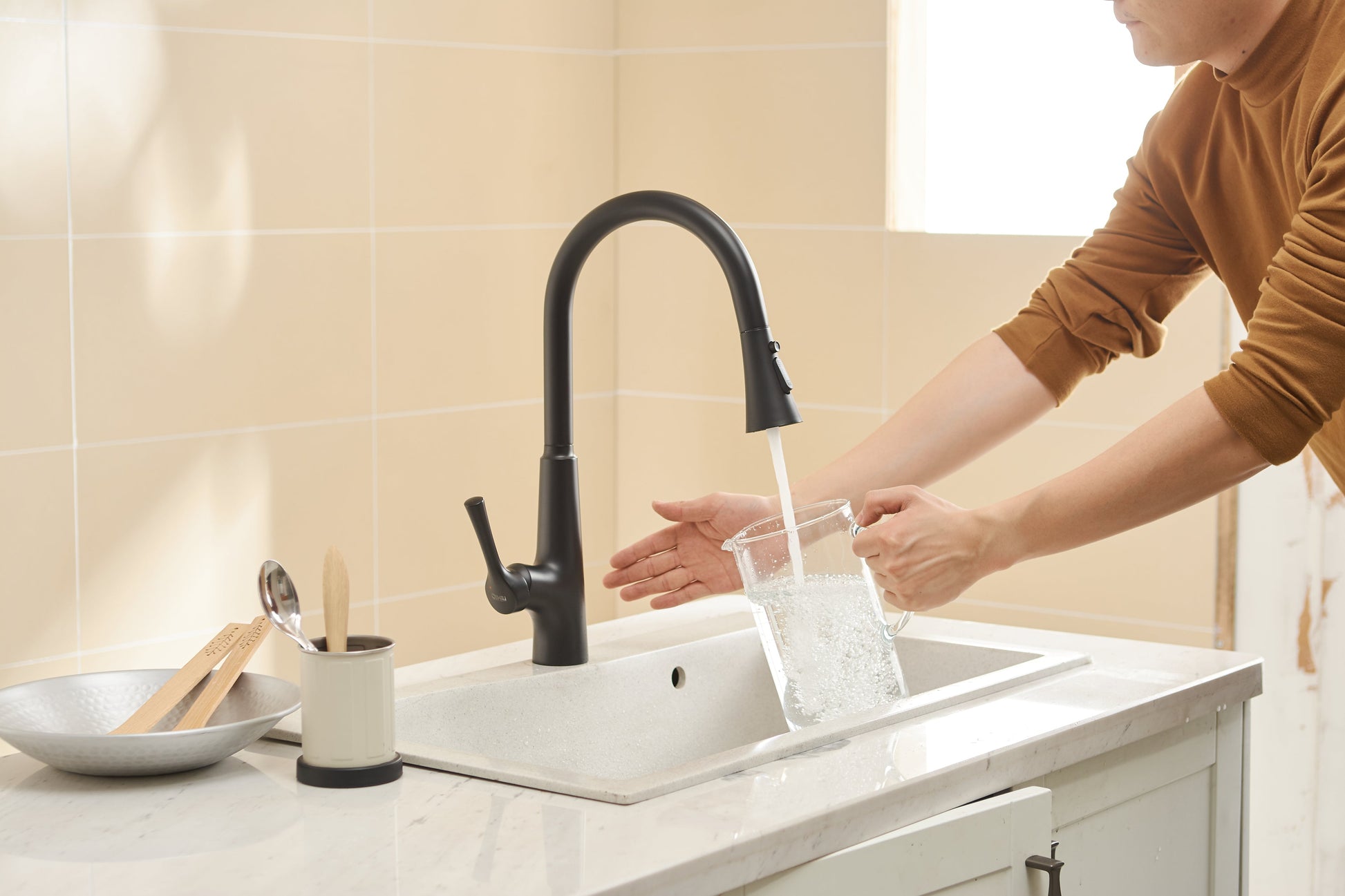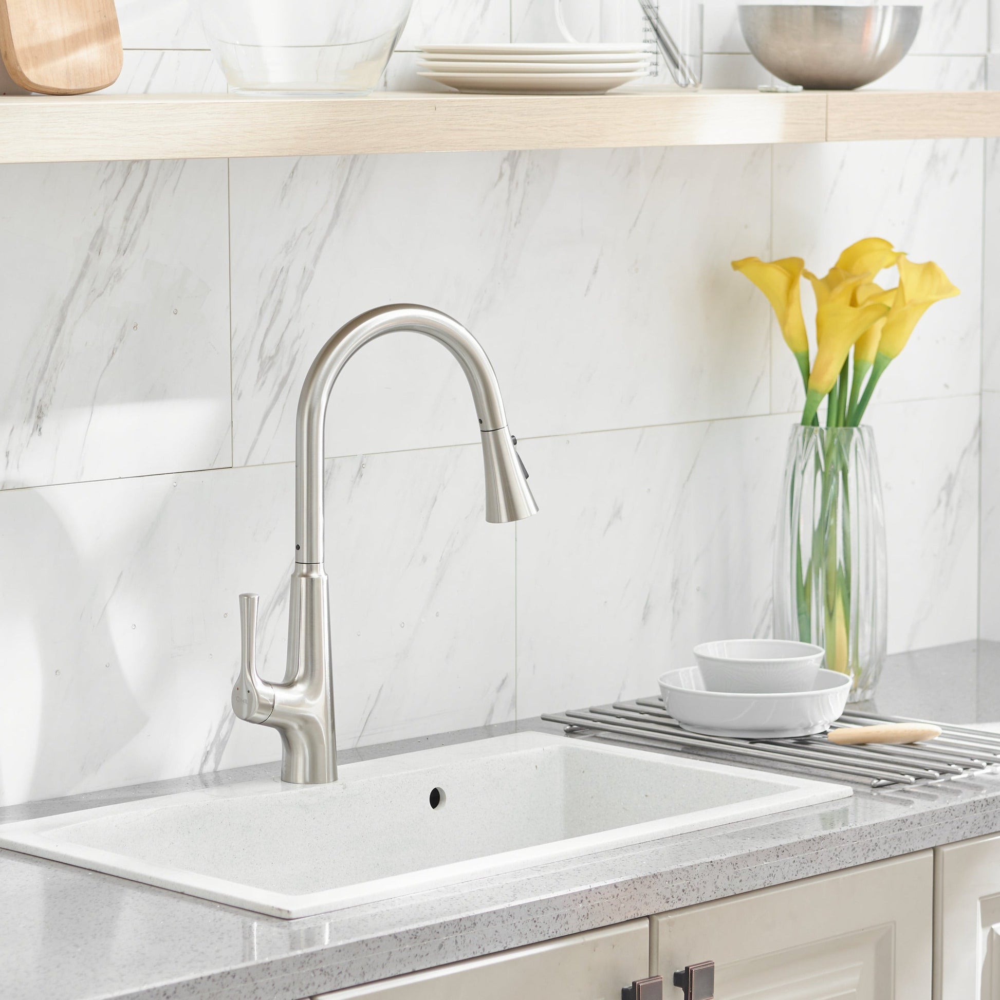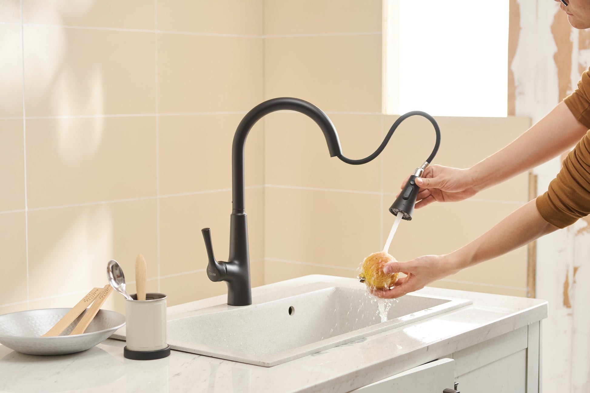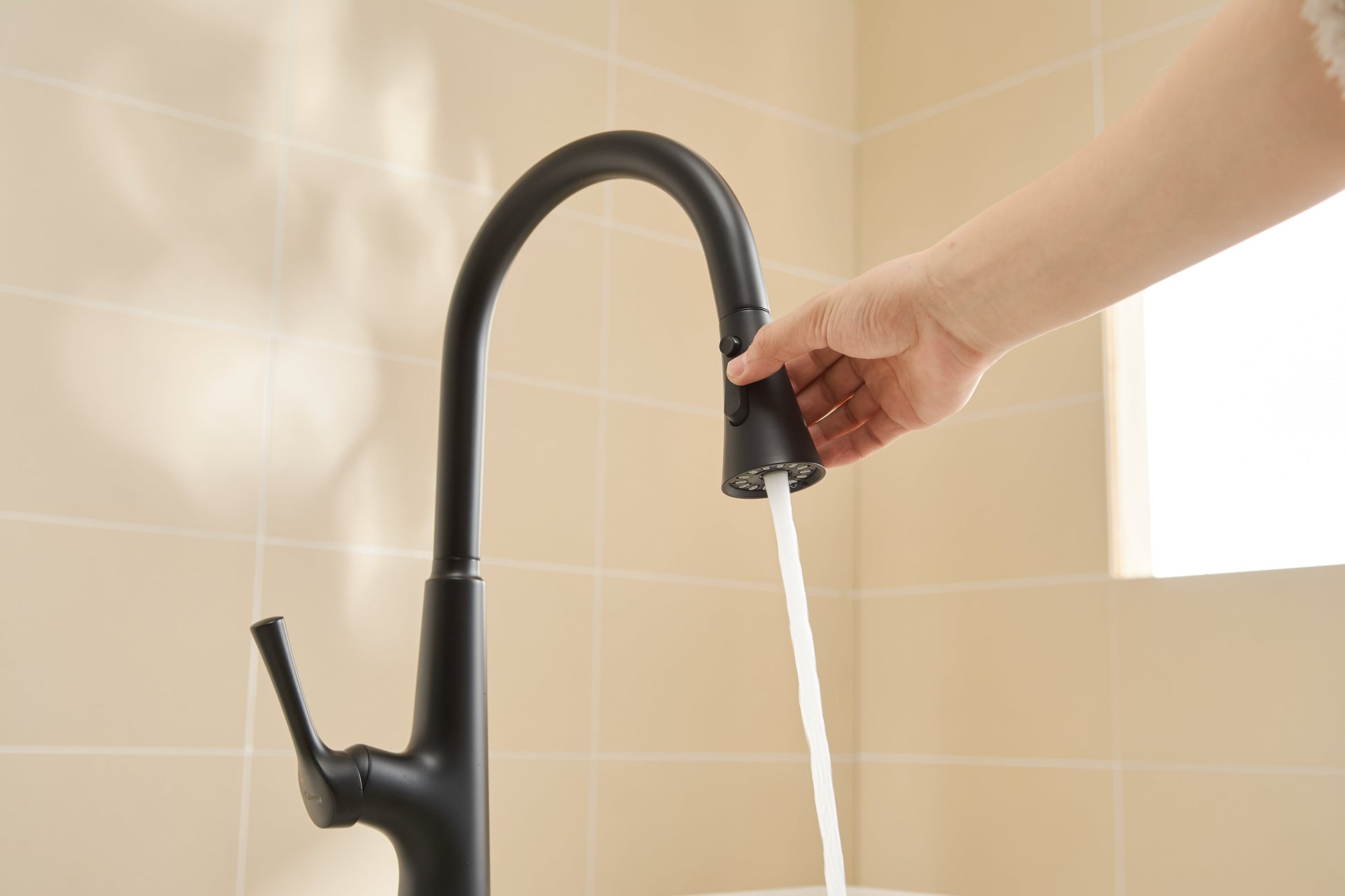 Perfect for busy kitchens, this faucet cuts down on germ transfer so that you no longer have to touch the faucet spout or handle when cleaning up after messy tasks like preparing raw foods. The conveniently located sensor sits on the side of the faucet to avoid interference with dishwashing and other kitchen tasks. The design features a pull-down spray head for superior maneuverability and an extended range of motion, allowing you to bend, flex, pivot, and reach all around the kitchen sink. The dual-function sprayer switches from aerated stream to powerful spray to rinse dishes and wash away stubborn residue. Heavy-duty construction and premium components ensure long-lasting use.