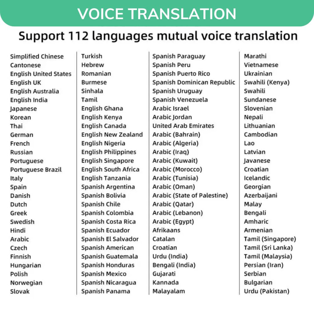 A: Our device supports voice translation in 112 languages, from Arabic and French to Japanese and Spanish, perfect for any global traveler, student, or professional.