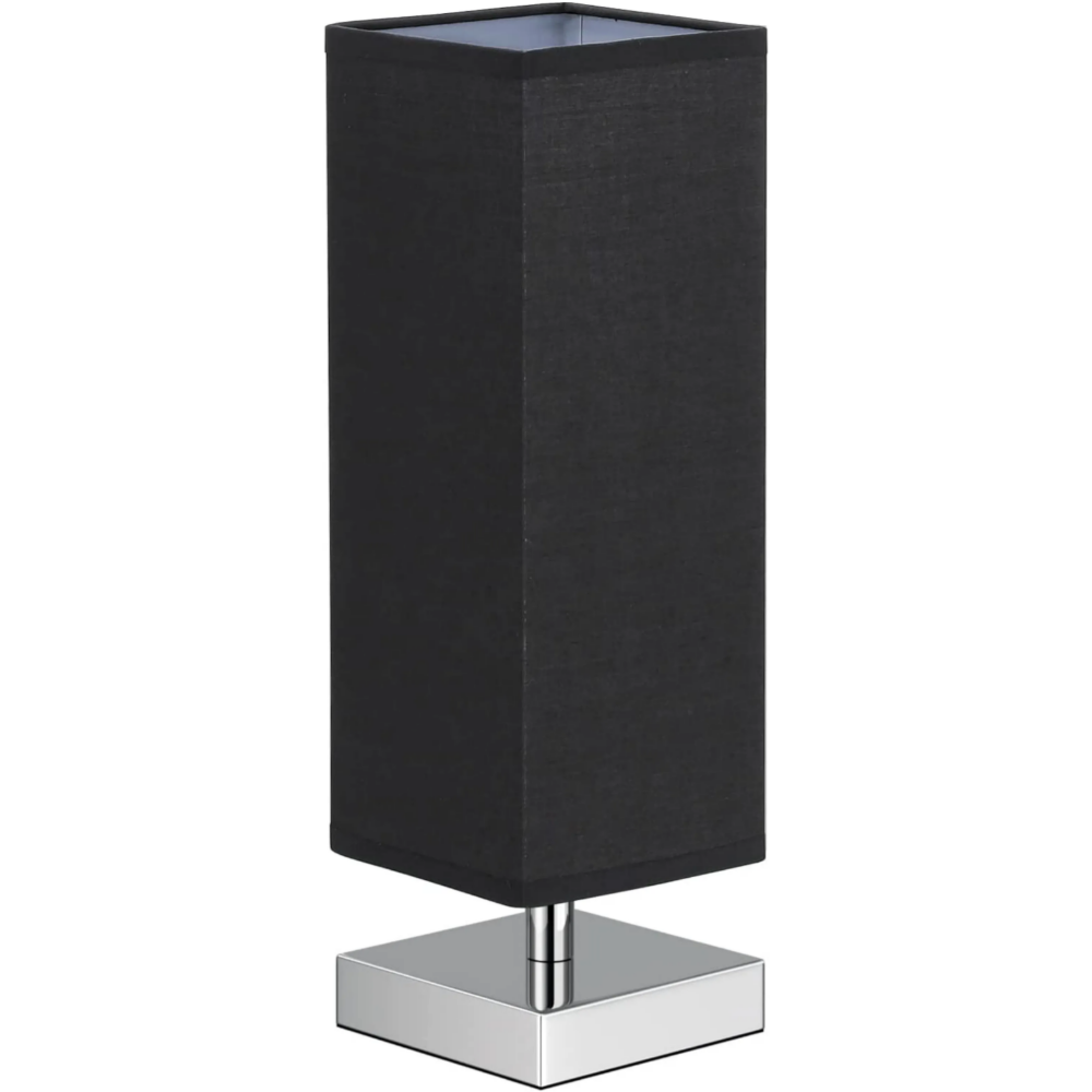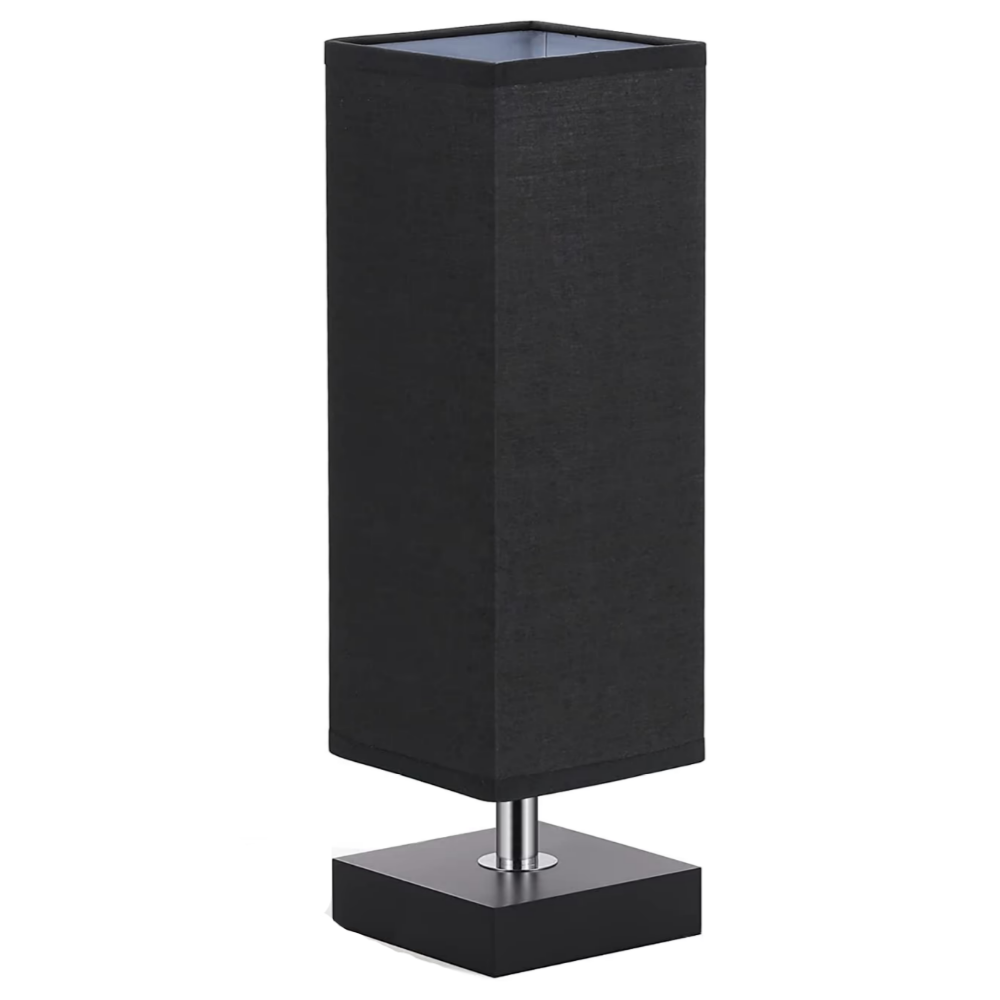 - The elegant sleek look of this table lamp elevates the aesthetic of your home, an open-top cloth shade of beige linen hovers over a petite black base of solid wood. The size and the design make this accent lamp a splendid accouterment for guest cottages and professional offices alike.