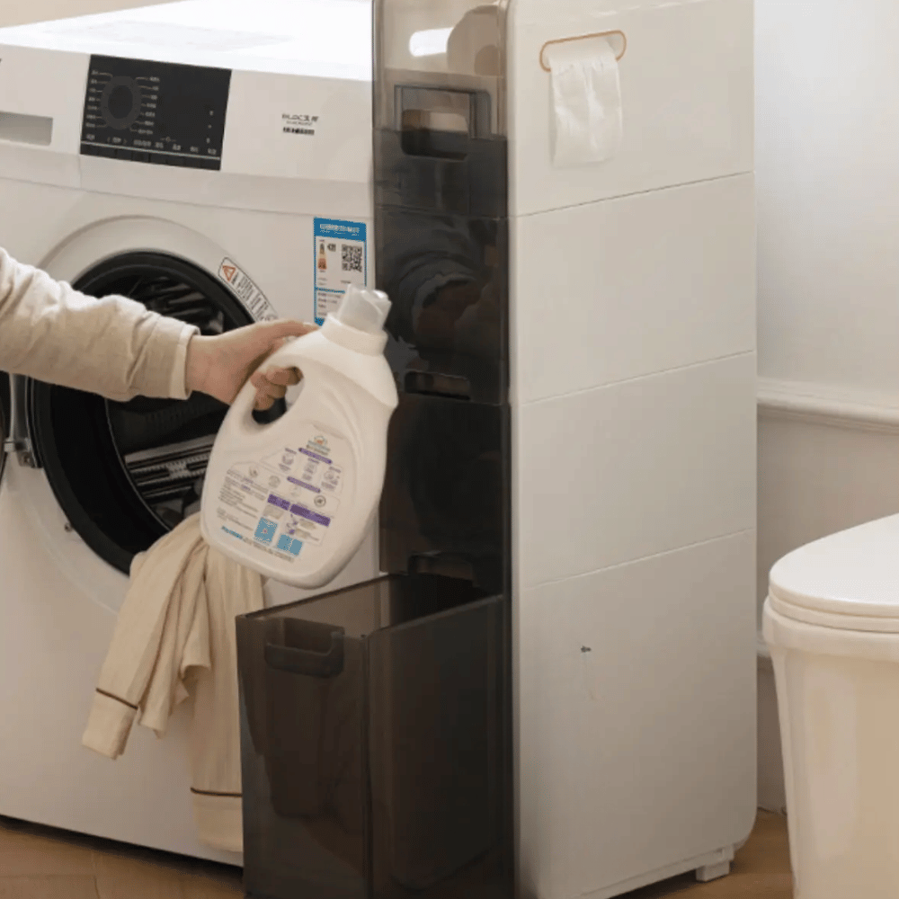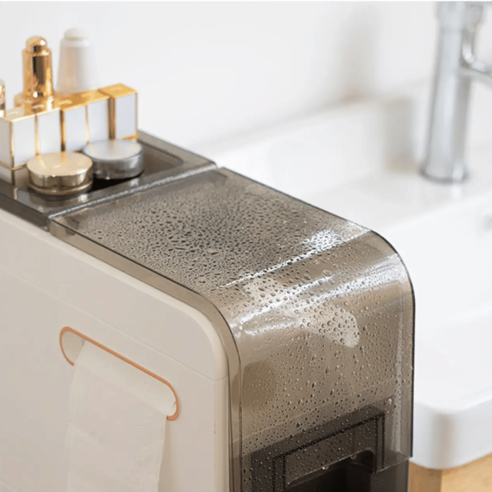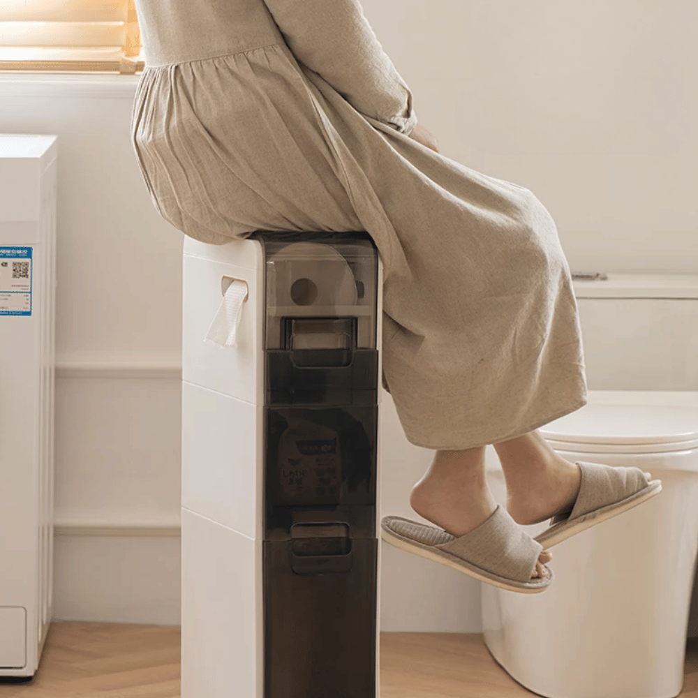 - The storage features 3 sliding drawers, a main storage space that has a place through which toilet paper can be placed, and 1 uncoated support for other cosmetic products.