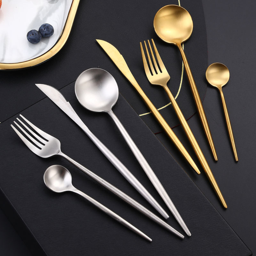 - The tableware set comes with exquisite set of 1 small spoon, 1 big spoon, 1 fork, and 1 table knife.