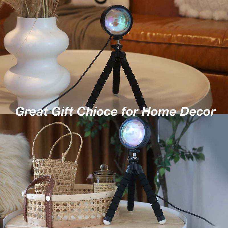 - Portable size: The lamp tripod can be rotated and adjusted. The Sunset Lamp head can be rotated 360 degrees, By changing the rotation angle and distance of the illuminator, different circular lights can be emitted from different angles, thereby bringing different effects. The farther the distance is, the larger the projection projected on the wall or ceiling.