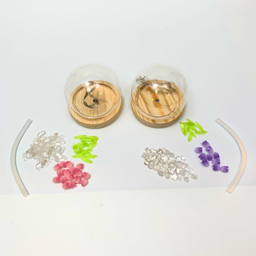 - The package comes with 1 wooden stand, 1 glass globe, 1, wire with LED lights, 10/16 tulips with leaves, and decorations to assemble.