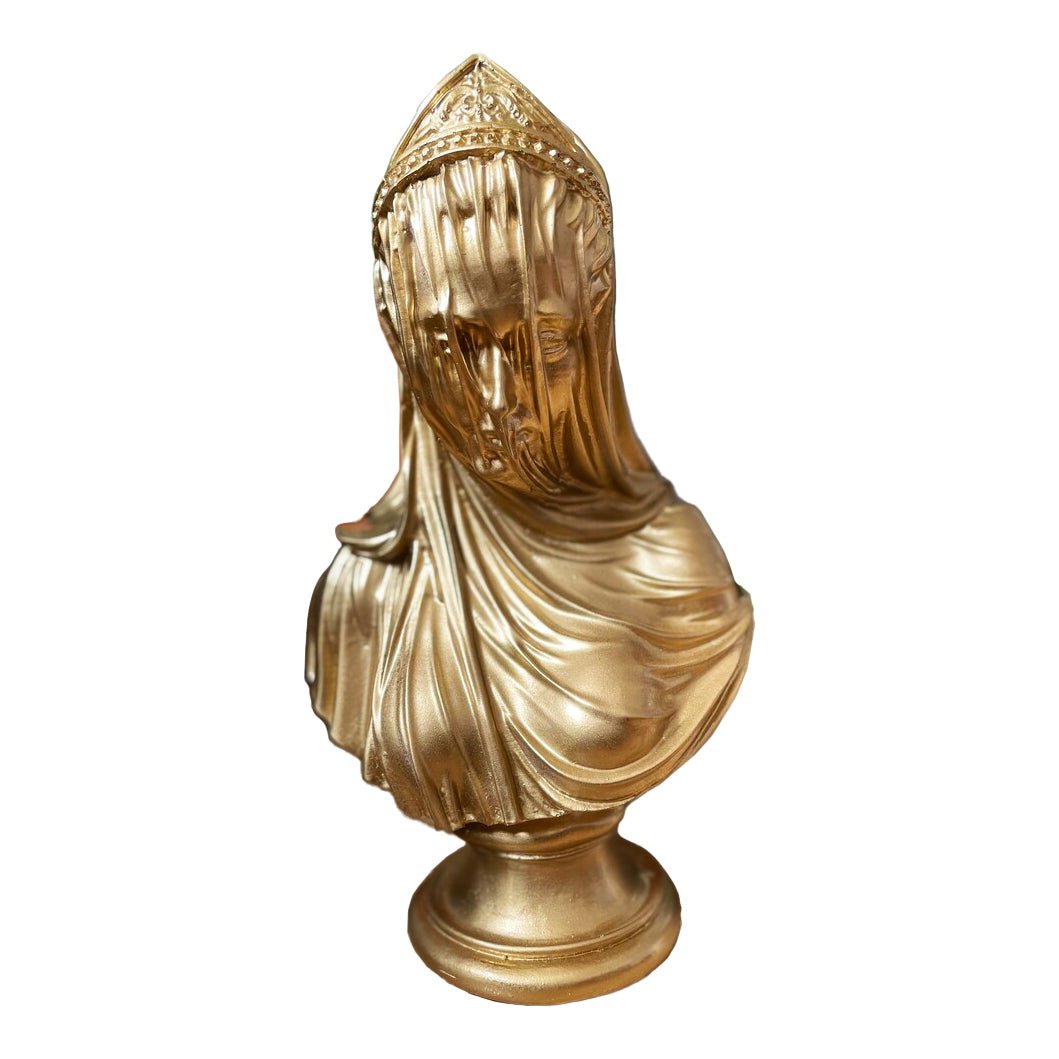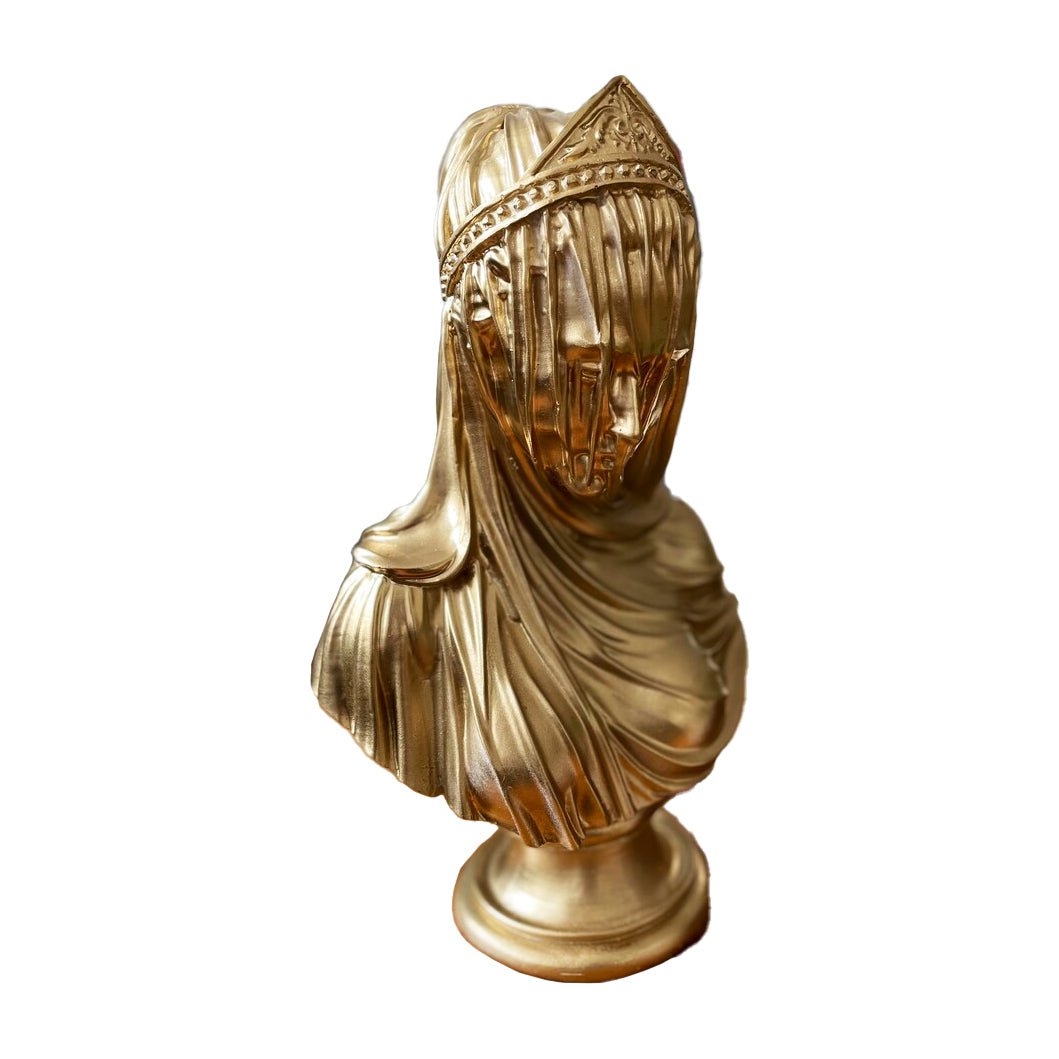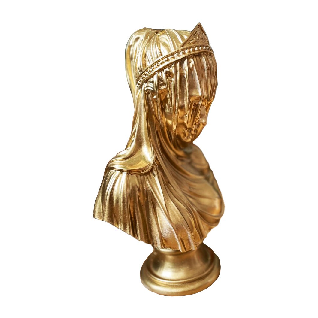 Introducing the Veiled Lady in Gold II Sculpture, a breathtaking and exquisite masterpiece that embodies grace and elegance. This exceptional sculpture portrays the head of a lady delicately covered in a mesmerizing golden veil, meticulously crafted with meticulous attention to detail. The lustrous gold finish adds a touch of opulence and allure to the artwork, elevating its beauty to new heights. The intricate details of the lady's serene face and the flowing folds of the veil create a sense of ethereal beauty and mystery. Whether displayed in an art gallery, an elegant living space, or a sophisticated office, the Veiled Lady in Gold II Sculpture becomes a captivating centerpiece, radiating an aura of sophistication and enchantment. Immerse yourself in the captivating presence of this sculpture, and let it inspire you with its timeless elegance and the allure of the veiled lady's hidden secrets.