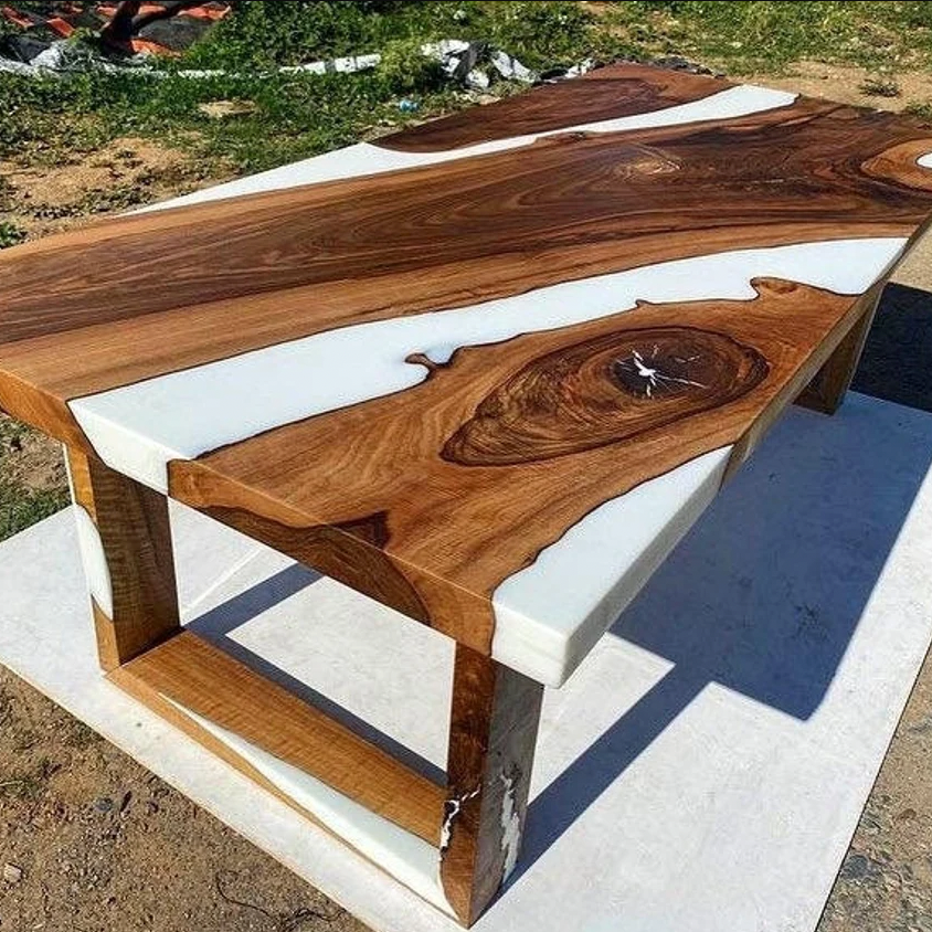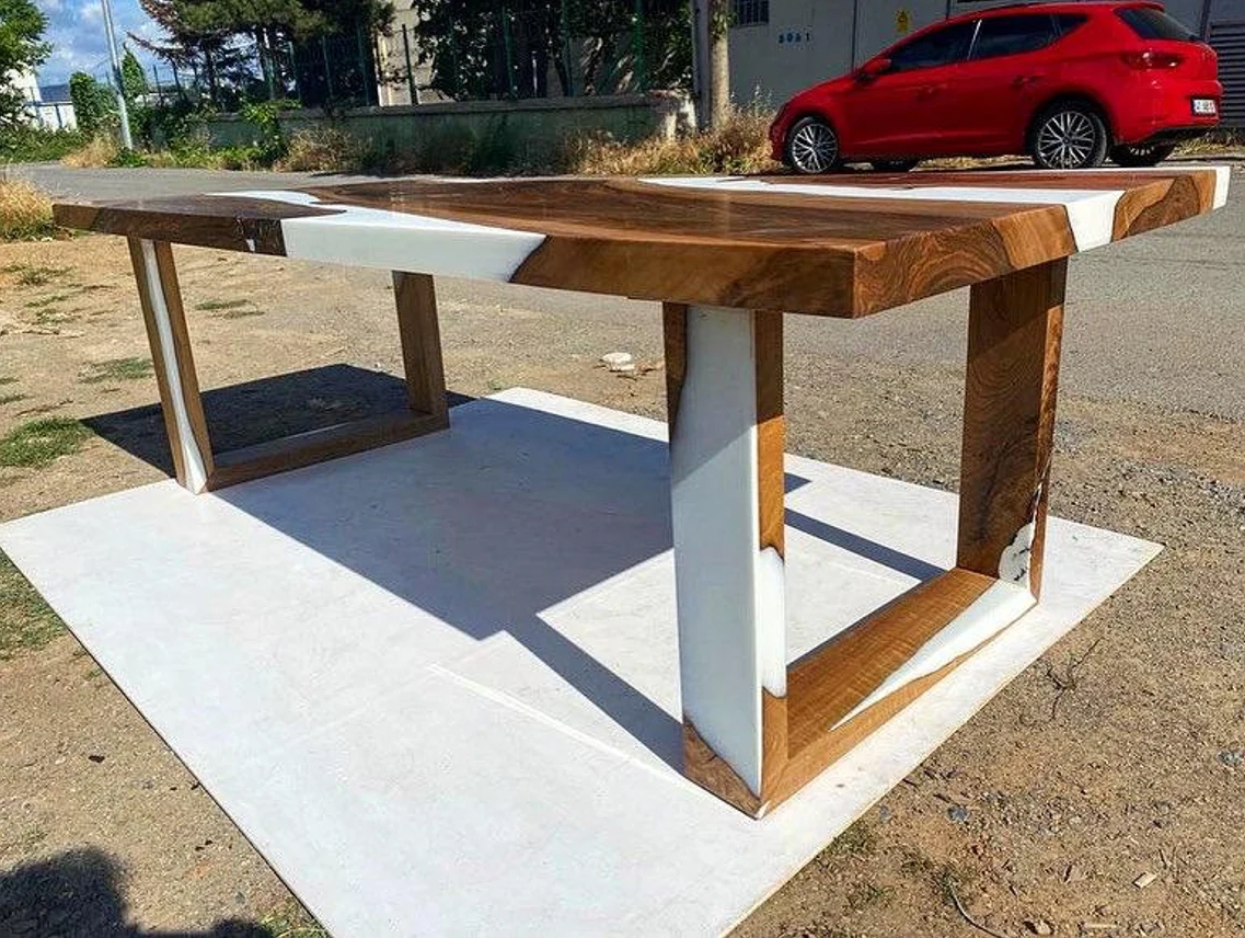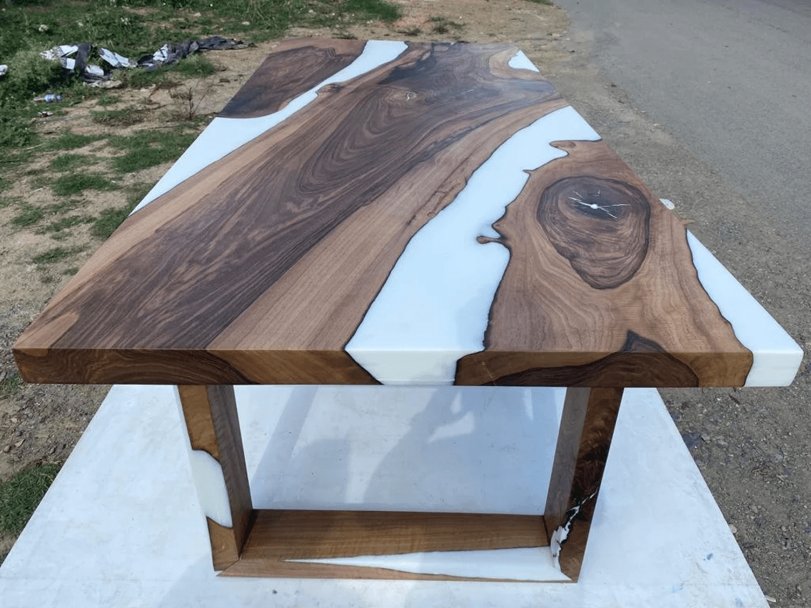 This beautiful table has a white epoxy fill that complements the solid slabs beautifully. It is truly a one-of-a-kind piece and brings more personality to your room than a normal table ever could.